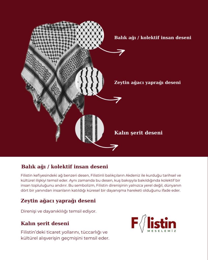 Filistin kefiyesi yalnızca bir tekstil ürünü değil; Filistin halkının yaşamından anlamlar taşıyan köklü tarihi bir sembol olarak bilinmektedir. Bu kültürel giysi, Filistinlilerin kimliğini, dayanışmasını ve özgürlük mücadelesini temsil eden güçlü bir simge olarak dünyada tanınmaktadır.